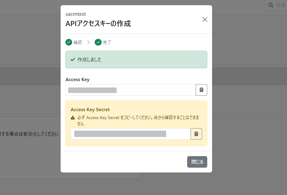 「APIアクセスキー」は SACM API を利用するための認証情報です。