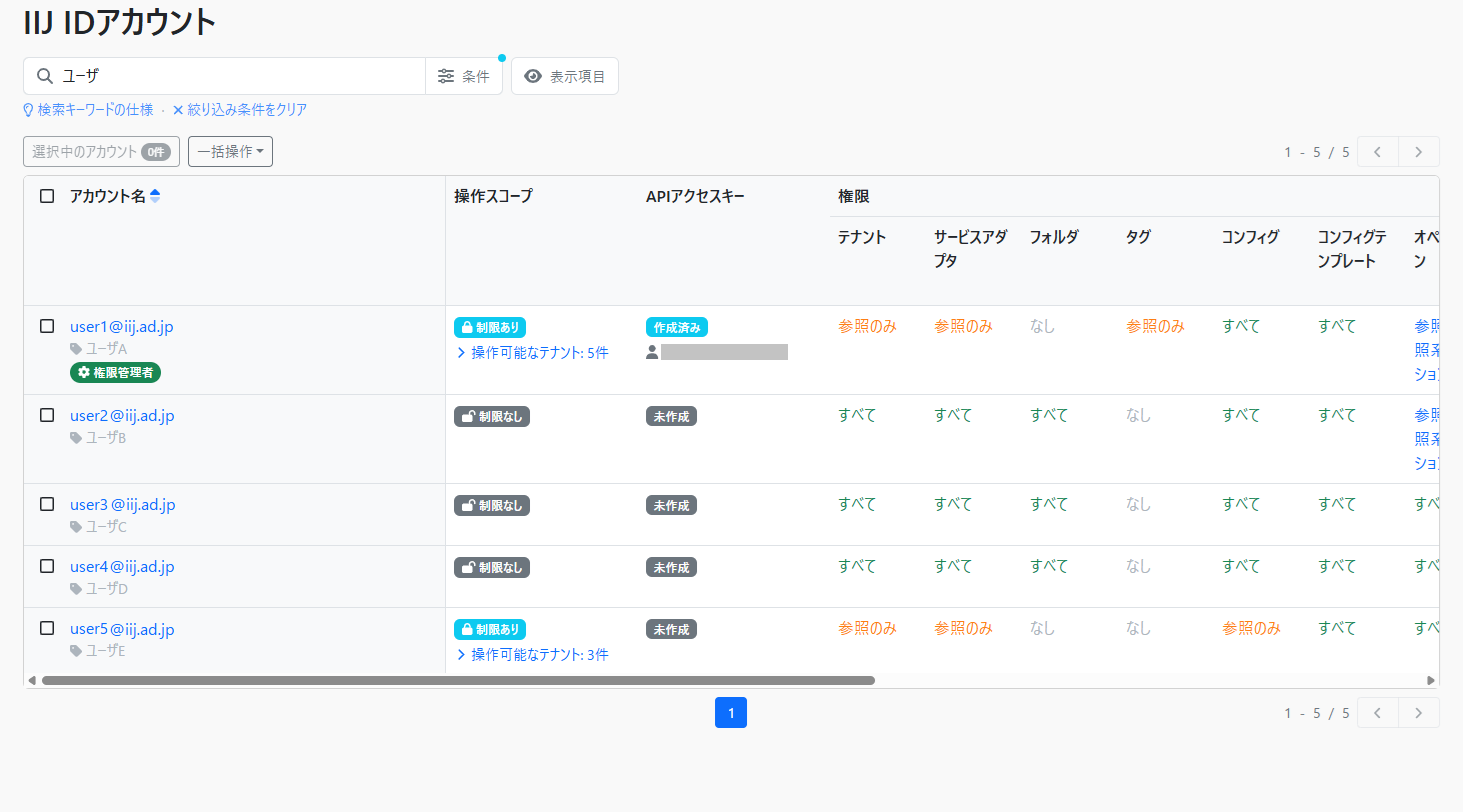 対象のアカウント種別のアカウントがラベル、権限、操作スコープ、APIアクセスキーの発行状況の情報と併せて一覧で表示されます。