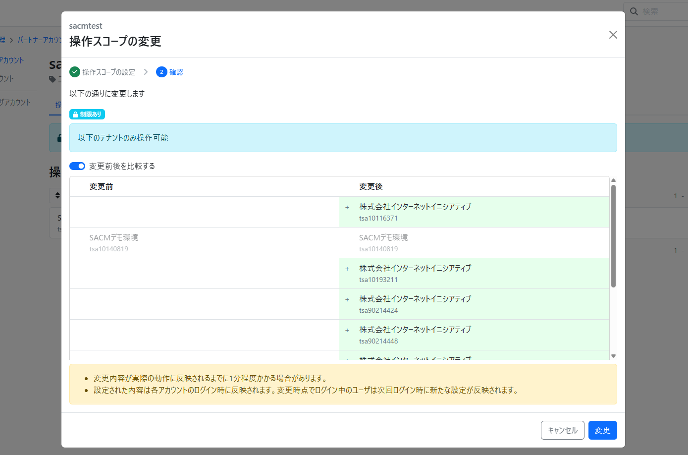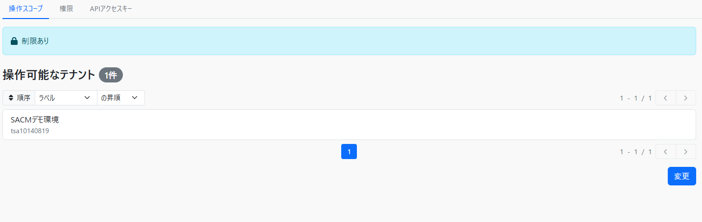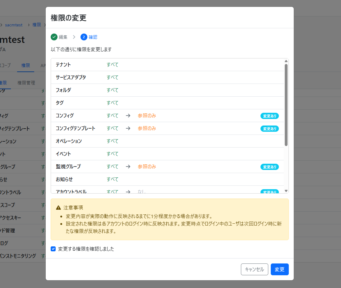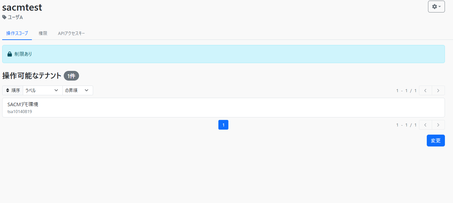 変更内容の確認後、「変更」ボタンを押すと操作スコープ設定が完了します。