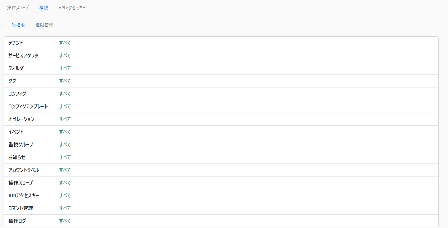 アカウント名,ラベル,テナント,サービスアダプタ,フォルダ,タグ,コンフィグ,コンフィグテンプレート,オペレーション,イベント,監視グループ,お知らせ,アカウントラベル,操作スコープ,APIアクセスキー,コマンド管理,操作ログ,アドバンストモニタリング