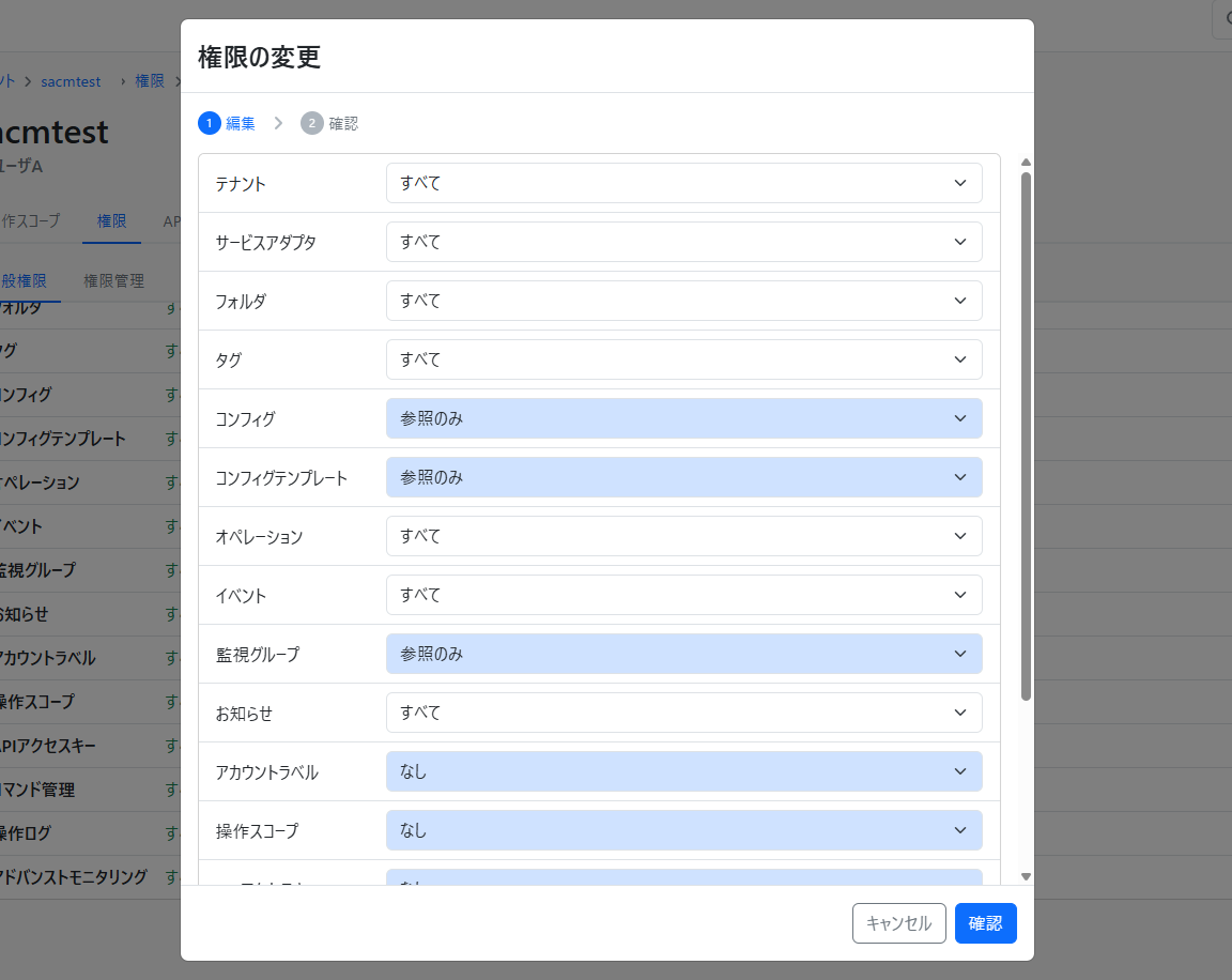 選択したアカウントについて操作スコープの設定を行います。