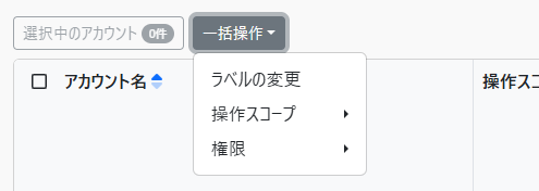 以下の一部の操作については、アカウント一覧画面から複数のアカウントを指定して「一括操作」ボタンから一括で操作を行うことができます。