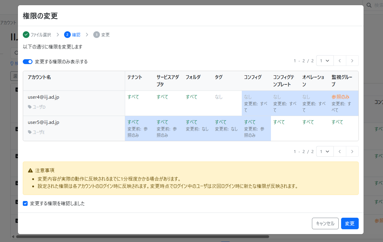 変更内容の確認後、「変更」ボタンを押すと権限設定が完了します。