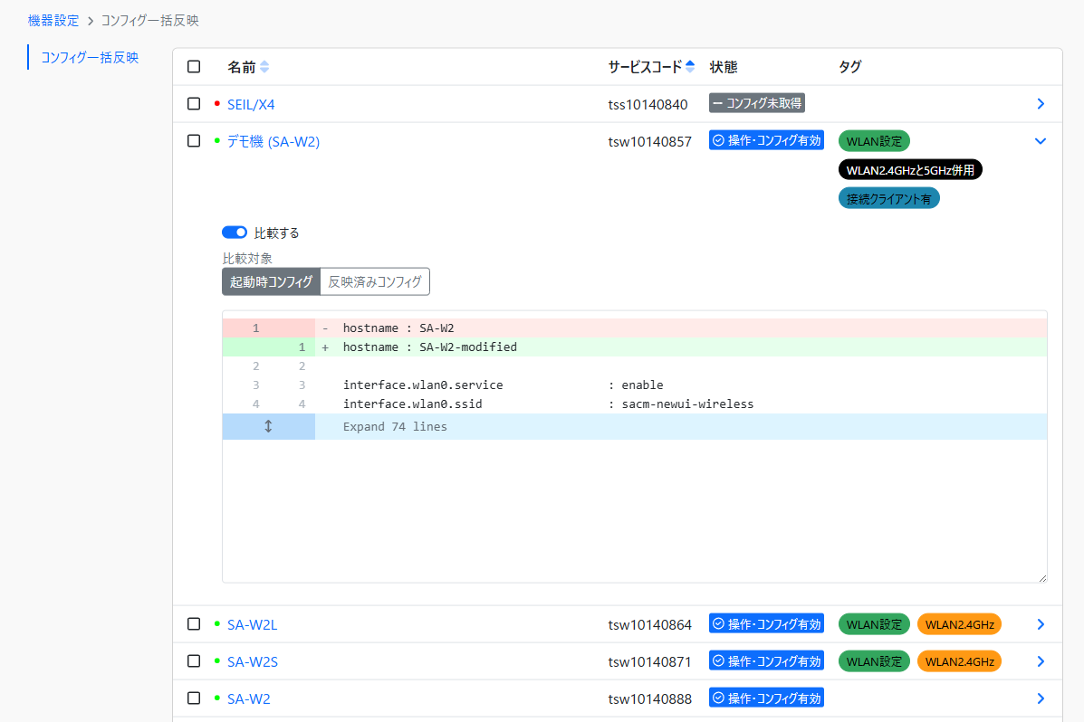 反映操作を行う前に、各サービスアダプタについて反映予定コンフィグの内容を確認したり、起動時コンフィグや反映済コンフィグとの差分を表示することもできます。