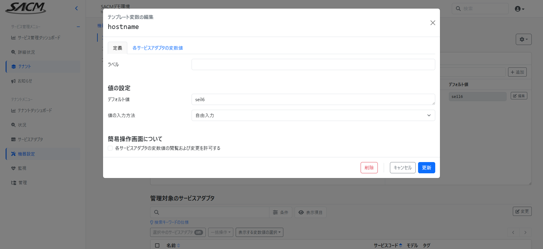 編集の他に「各サービスアダプタの変数値」よりサービスアダプタの変数値の変更もできます。