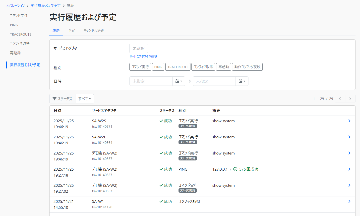 実行結果や実行予定の登録状況は「実行履歴および予定」から確認できます。