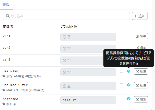 「各サービスアダプタの変数値の閲覧および変更を許可する」設定がされているテンプレート変数のみが表示されます。