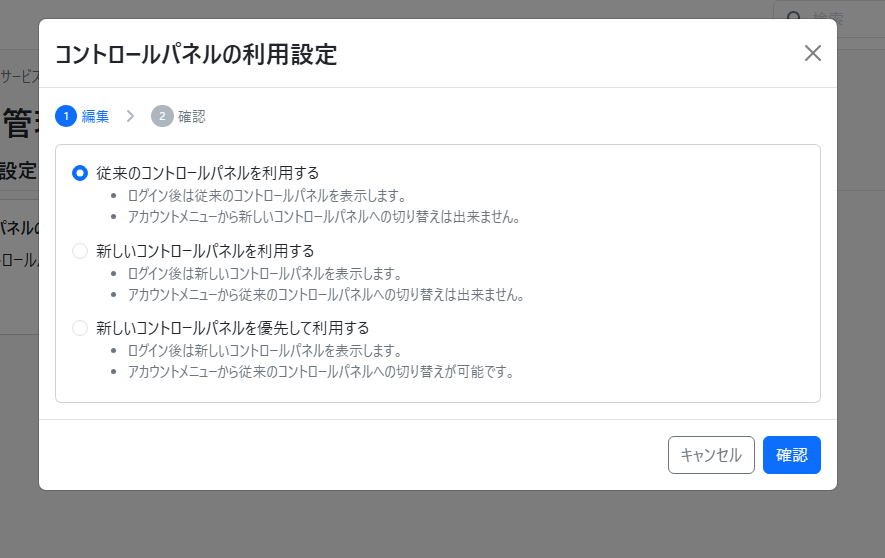 アカウントメニューから新しいコントロールパネルへの切り替えは出来ません。